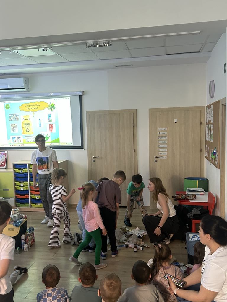 Podczas zajęć dzieci z entuzjazmem poznawały zasady prawidłowej segregacji – uczyły się, do jakiego koloru worka trafić powinien papier, szkło, plastiki czy bioodpady, i dlaczego warto ograniczać odpady zmieszane. Rozmawialiśmy także o tym, jak codzienne nawyki, takie jak oszczędzanie wody i energii, wpływają na środowisko.